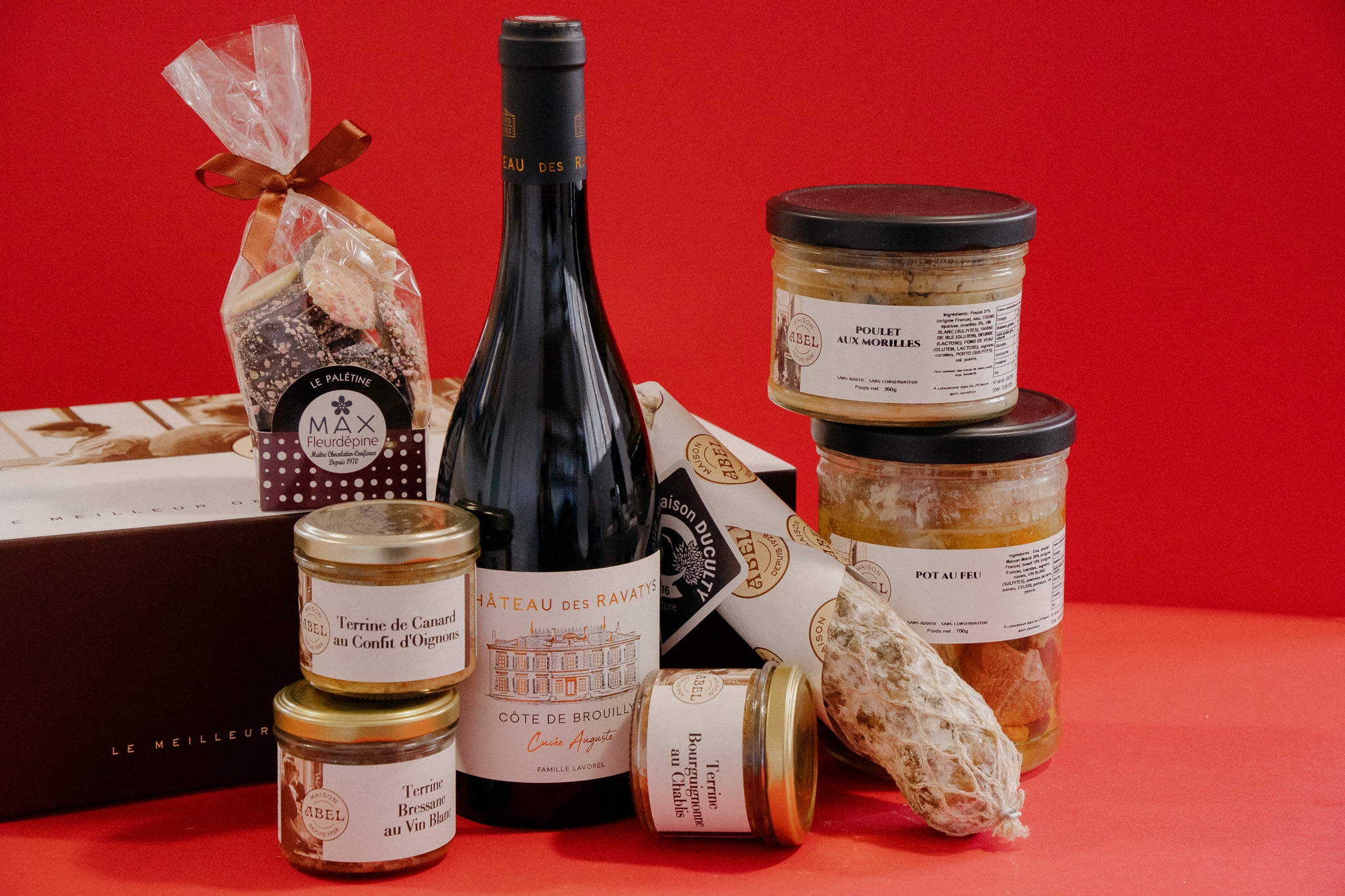 Terrine de la maison Abel, 90gr : viande et gras de porc 50% (origine France tue de porc 34%, eau, vin de chablis 2.4% (sulfites oignons, sel, gélatine, poudre de lait écrémé, fécule de pommes de terre, moutarde, ail, thym, poivre. Valeurs nutritionnelles moyennes pour 100g : énergie 1193j/288 kcal; matières grasses 23g dont acides gras saures 8,6g; glucides 5,6,0g dont sucres 0,6g; protéines 15g; sel 1,6g.